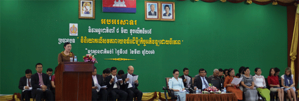 On March 7th, 2016, the Ministry of Education, Youth and Sport (MoEYS) organized the 105th International Women’s Day Celebration under the theme, “Invest on Gender Equality for Sustainable Development.” The University of Cambodia was represented by Ms. Por Malis, Vice President of Operations, Ms. Toptosseda Uk, Director of the Office of the President, and Ms. Kong Rathana, Director of the Offiice of the Registrar. The event was presided over by H.E. Hang Chuon Naron, Minister of Education, Youth and Sport and his wife.