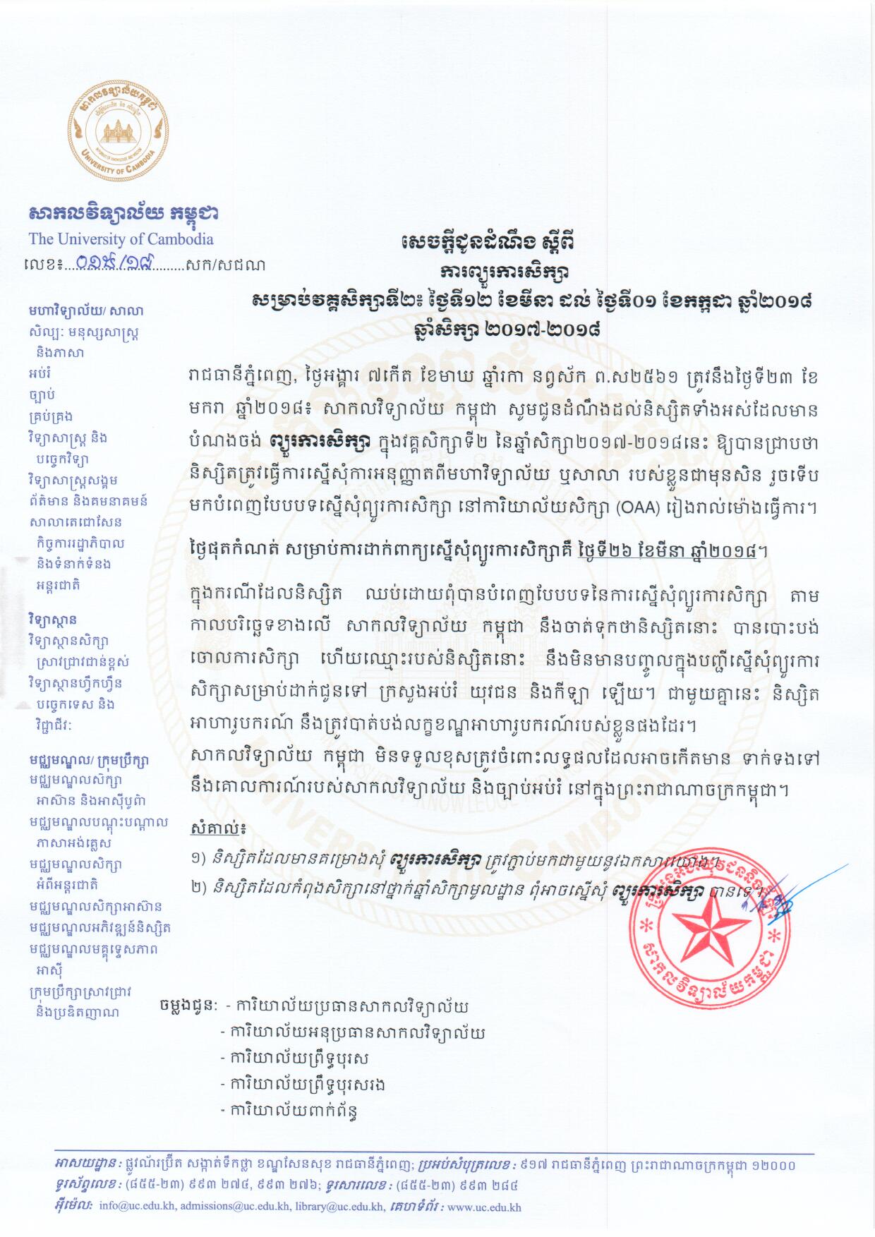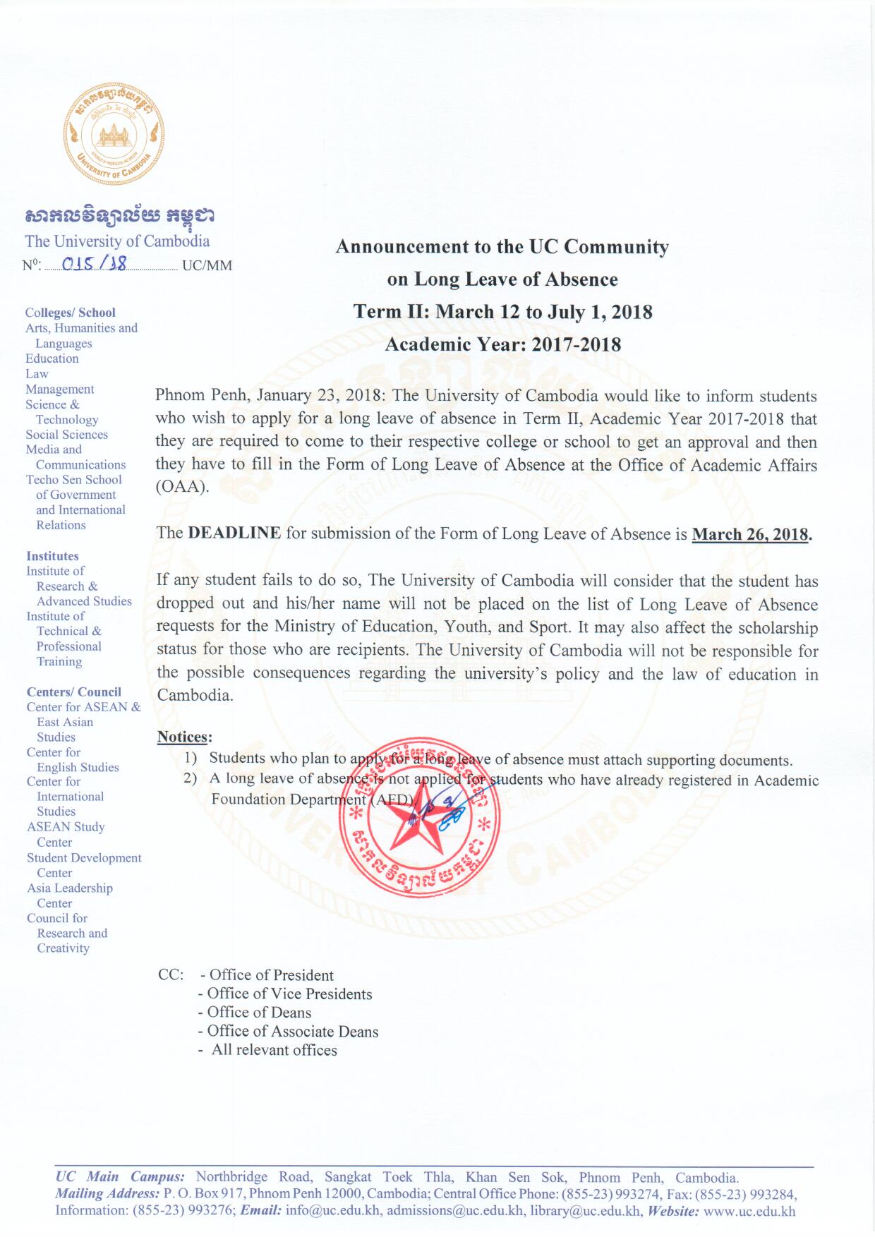 Announcement to the UC Community on Long Leave of Absence Term II: March 12 to July 1, 2018 Academic Year: 2017-2018 (Khmer and English)