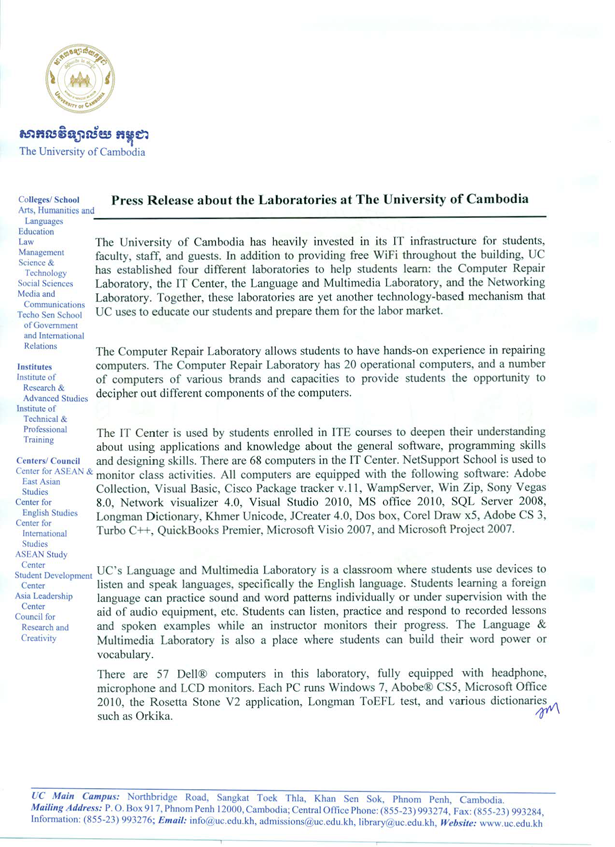 Home » Press Releases » Press Release about the Laboratories at The University of Cambodia
