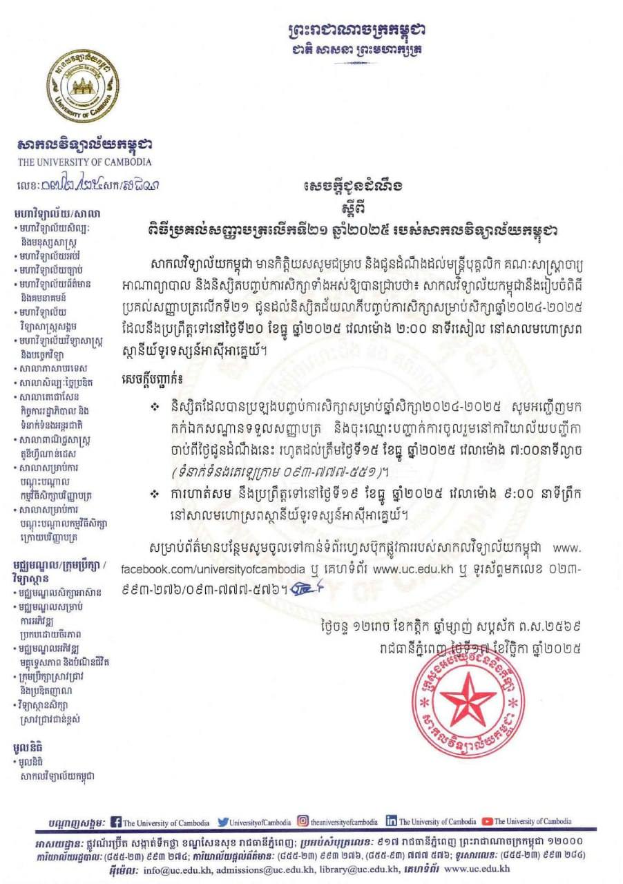 សេចក្តីជូនដំណឹងស្តីពី ពិធីប្រគល់សញ្ញាបត្រលើកទី២១ ឆ្នាំ២០២៥ របស់សាកលវិទ្យាល័យកម្ពុជា