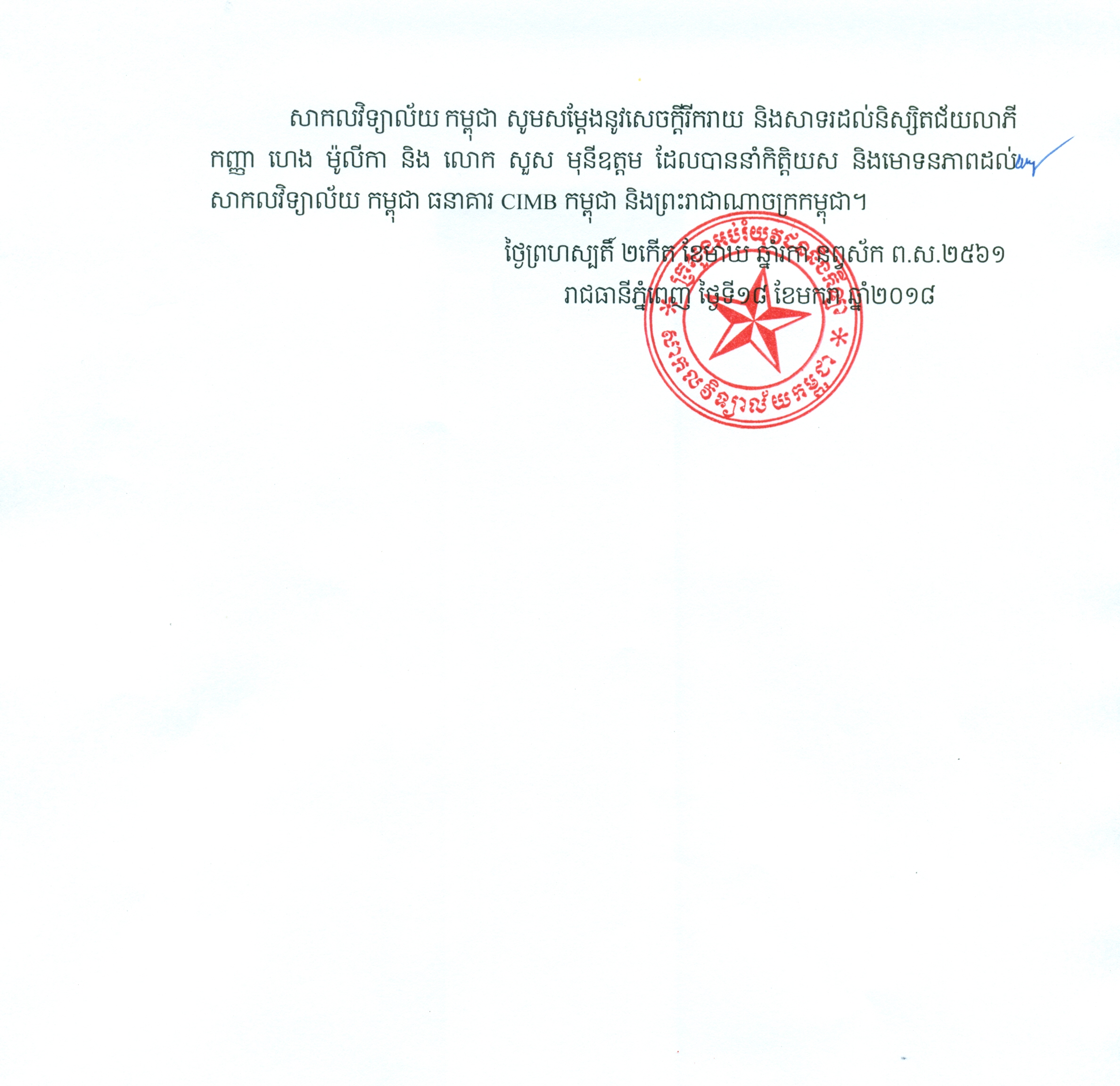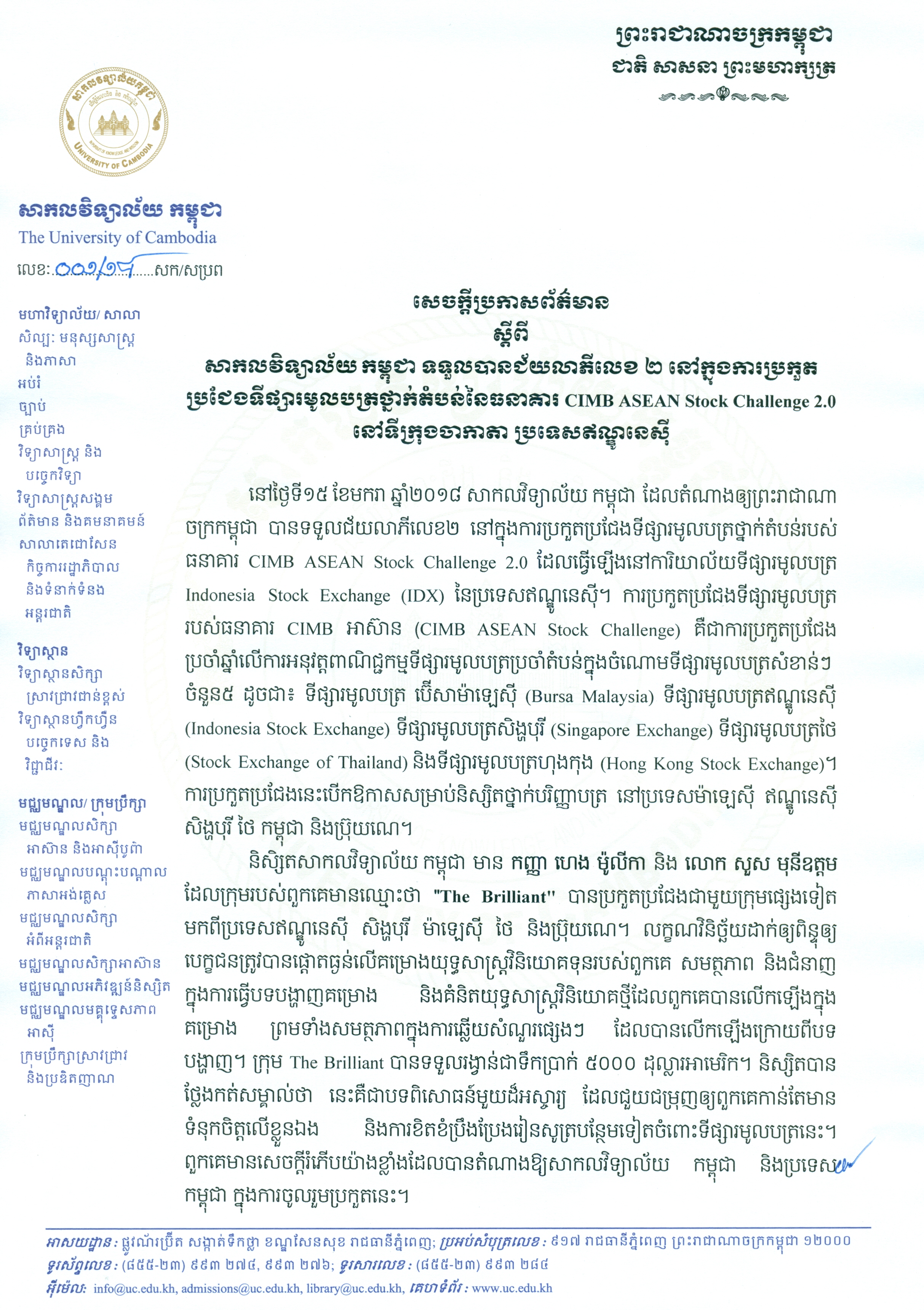 សេចក្តីប្រកាសព័ត៌មាន ស្តីពី សាកលវិទ្យាល័យ កម្ពុជា ទទួលបានជ័យលាភីលេខ ២ នៅក្នុងការប្រកួត ប្រជែងទីផ្សារមូលបត្រថ្នាក់តំបន់នៃធនាគារ CIMB ASEAN Stock Challenge 2.0 នៅទីក្រុងចាកាតា ប្រទេសឥណ្ឌូនេស៊ី