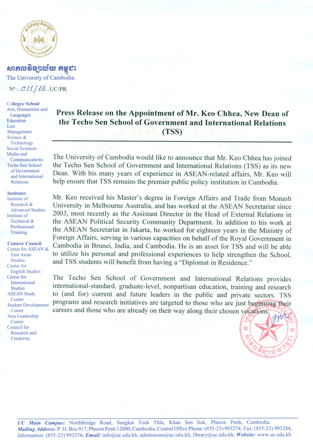 Press Release on the Appointment of Mr. Keo Chhea, New Dean of TSS