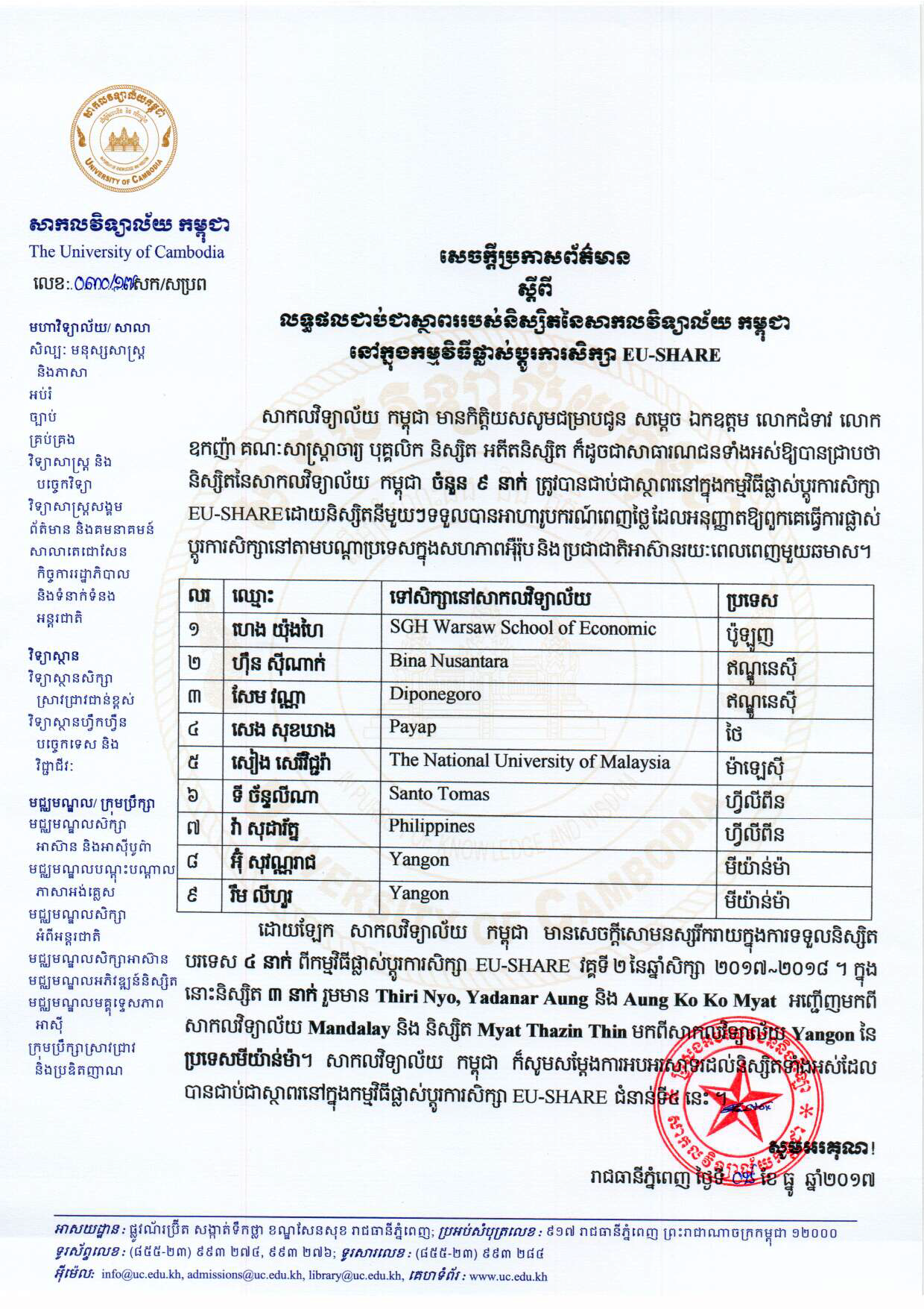 សេចក្តីប្រកាសព័ត៌មាន ស្តីពី លទ្ធផលជាប់ជាស្ថាពររបស់និស្សិតនៃសាកលវិទ្យាល័យ កម្ពុជា នៅក្នុងកម្មវិធីផ្លាស់ប្តូរការសិក្សា EU-SHARE