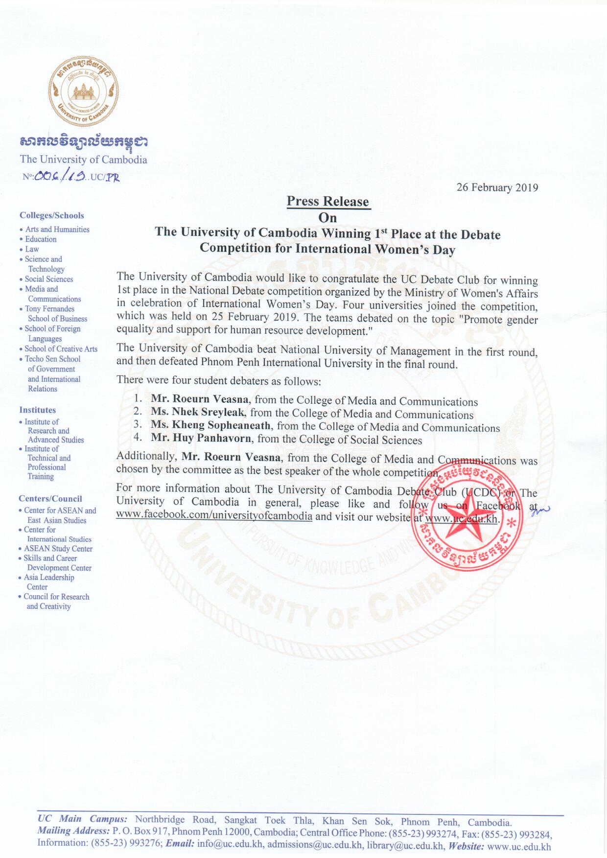 Press Release On The University of Cambodia Winning 1st Place at the Debate Competition for International Women’s Day