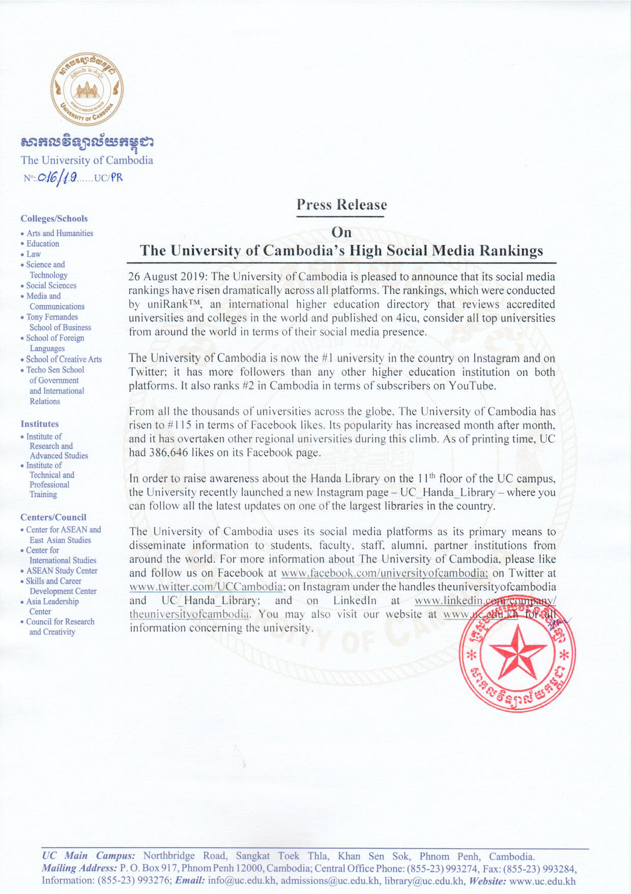 Press Release On The University of Cambodia’s High Social Media Rankings