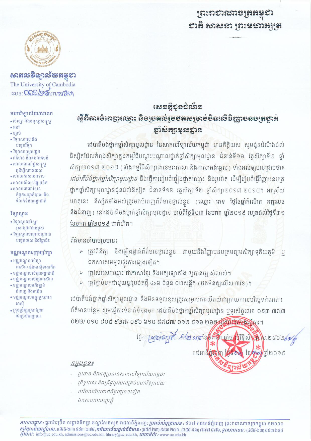 សេចក្តីជូនដំណឹង ស្តីពីការបំពេញឈ្មោះ និងប្រគល់រូបថតសម្រាប់បិទលើវិញ្ញាបនបត្រថ្នាក់ឆ្នាំសិក្សាមូលដ្ឋាន