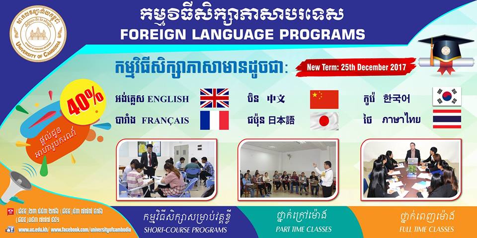 ឱកាសពិសេស!!! បានមកដល់ហើយ!!! បើកវគ្គសិក្សាថ្មី៦ភាសាក្នុងពេលតែ១នៅសាកលវិទ្យាល័យ កម្ពុជា៖ ភាសាអង់គ្លេស បារាំង ចិន ជប៉ុន កូរ៉េ និងថៃ (ពេញម៉ោង និងក្រៅម៉ោង) ដែលនឹងត្រូវចាប់ផ្តើមចូលសិក្សាថ្ងៃទី២៥ ខែធ្នូ ឆ្នាំ២០១៧ខាងមុខនេះ