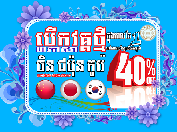ឱកាសពិសេស!!! បានមកដល់ហើយ!!! បើកវគ្គសិក្សាថ្មី៣ភាសាក្នុងពេលតែ១នៅសាកលវិទ្យាល័យ កម្ពុជា៖ ភាសាចិន ភាសាជប៉ុន និងភាសាកូរ៉េ (ពេញម៉ោង និងក្រៅម៉ោង) ដែលនឹងត្រូវចាប់ផ្តើមចូលសិក្សាថ្ងៃទី៦ ខែវិច្ឆិកា ឆ្នាំ២០១៧ខាងមុខនេះ